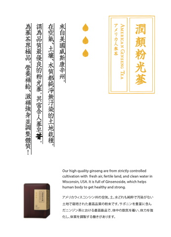 アメリカウィスコンシン州の空気、土、水どれも純粋で汚染がない 土地で栽培された最高品質の粉末です。サポニンを豊富に含ん だニンジン茶における最高級品で、体中の鋭気を養い、体力を強 化し、体質を調製する働きがあります。