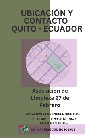 UBICACIÓN Y CONTACTO QUITO - ECUADOR Asociación de Limpieza 27 de Febrero AV. YAJAVI Y LOS ENCUENTROS # 313 CELULAR: +593 98 683 9627 SR. LUIS ESPINOZA CONTÁCTESE CON NOSOTROS 14
