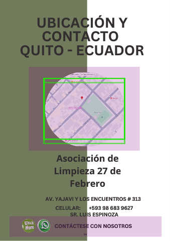 UBICACIÓN Y CONTACTO QUITO - ECUADOR Asociación de Limpieza 27 de Febrero AV. YAJAVI Y LOS ENCUENTROS # 313 CELULAR: +593 98 683 9627 SR. LUIS ESPINOZA CONTÁCTESE CON NOSOTROS 14