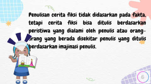 Penulisan cerita fiksi tidak didasarkan pada fakta, tetapi cerita fiksi bisa ditulis berdasarkan peristiwa yang dialami oleh penulis atau orang- orang yang berada disekitar penulis yang ditulis berdasarkan imajinasi penulis. 6