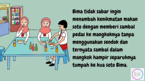 Bima tidak sabar ingin menambah kenikmatan makan soto dengan memberi sambal pedas ke mangkoknya tanpa menggunakan sendok dan ternyata sambal dalam mangkok hampir separuhnya tumpah ke kua soto Bima. 54