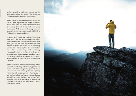 In short, while I wish we could do/have done even more, I feel that IAVH is in a good situation now and I hope this can continue into the future. Next year will be time for elections for new officers, so please consider if this is something you can do. I would say that it is an important time for homeopathy and veterinary homeopathy, but in reality it is always an important time for these as we have been rather on the outside and swimming against the current almost as long as there has been homeopathic medicine.