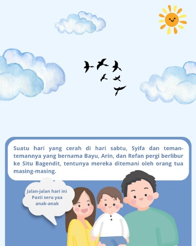 Suatu hari yang cerah di hari sabtu, Syifa dan teman- temannya yang bernama Bayu, Arin, dan Refan pergi berlibur ke Situ Bagendit, tentunya mereka ditemani oleh orang tua masing-masing. Jalan-jalan hari ini Pasti seru yaa anak-anak