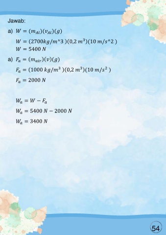 Jawab: a) = ( )( )( ) 3 = (2700 / ^3 )(0,2 )(10 / ^2 ) = 5400 a) = ( )( )( ) 2 3 3 = (1000 / )(0,2 )(10 / ) = 2000 = − = 5400 − 2000 = 3400 54
