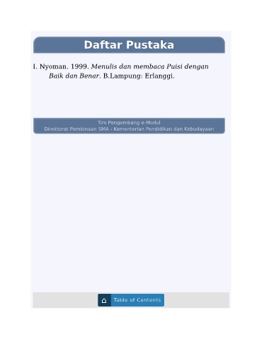 Daftar Pustaka Daftar Pustaka I. Nyoman. 1999. Menulis dan membaca Puisi dengan Baik dan Benar. B.Lampung: Erlanggi. Tim Pengembang e-Modul Direktorat Pembinaan SMA - Kementerian Pendidikan dan Kebudayaan ⌂ ⌂ Table of Contents Table of Contents