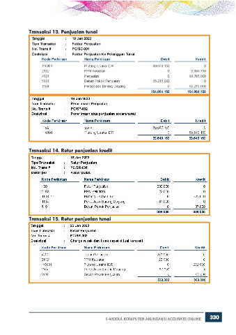 Transaksi 13. Penjualan tunai Transaksi 14. Retur penjualan kredit Transaksi 15. Retur penjualan tunai E-MODUL KOMPUTER AKUNTANSI ACCURATE ONLINE 330