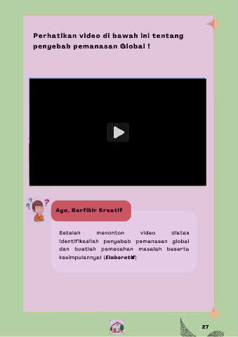 Perhatikan video di bawah ini tentang penyebab pemanasan Global ! Ayo, Berfikir Kreatif Setelah menonton video diatas identifikasilah penyebab pemanasan global dan buatlah pemecahan masalah beserta kesimpulannya! (Elaboratif) 27