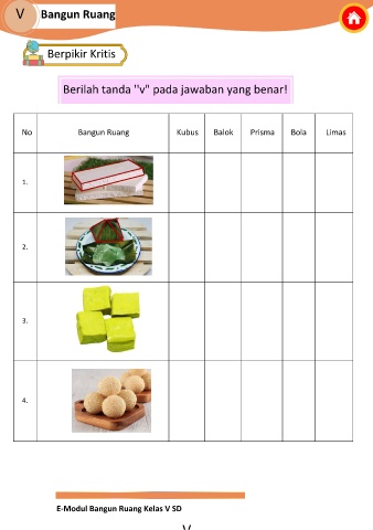 V Bangun Ruang Berpikir Kritis Berilah tanda ''v" pada jawaban yang benar! No Bangun Ruang Kubus Balok Prisma Bola Limas 1. 2. 3. 4. E-Modul Bangun Ruang Kelas V SD V