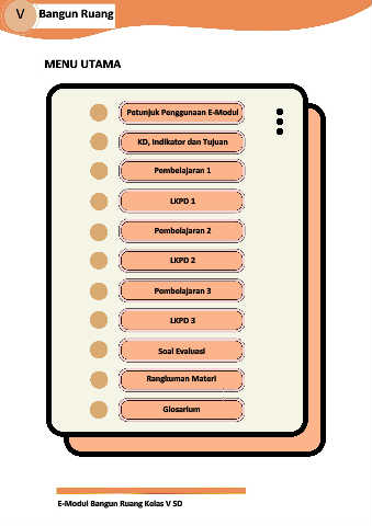 V Bangun Ruang MENU UTAMA Petunjuk Penggunaan E-Modul KD, Indikator dan Tujuan Pembelajaran 1 LKPD 1 Pembelajaran 2 LKPD 2 Pembelajaran 3 LKPD 3 Soal Evaluasi Rangkuman Materi Glosarium E-Modul Bangun Ruang Kelas V SD