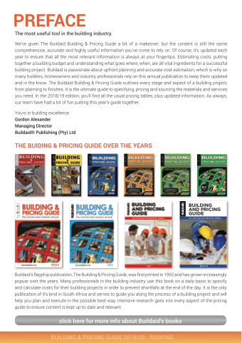 The Building and Pricing Guide features comprehensive, accurate and highly useful informa on that you can rely on. It’s updated each year to ensure that all the most relevant informa on is aways at your  nger ps. This book is an absolute must-have for anyone opera ng in the building & construc on industry seeking to make well informed and cost e cient choices to get the job done.