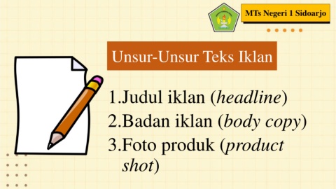 MTs Negeri 1 Sidoarjo Unsur-Unsur Teks Iklan 1.Judul iklan (headline) 2.Badan iklan (body copy) 3.Foto produk (product shot)