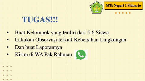 MTs Negeri 1 Sidoarjo TUGAS!!! • Buat Kelompok yang terdiri dari 5-6 Siswa • Lakukan Observasi terkait Kebersihan Lingkungan • Dan buat Laporannya • Kirim di WA Pak Rahman