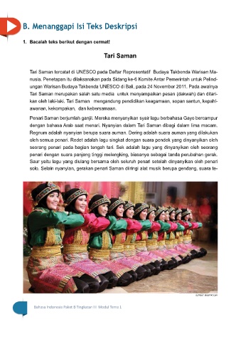 kan oleh laki-laki. Tari Saman mengandung pendidikan keagamaan, sopan santun, kepahl-