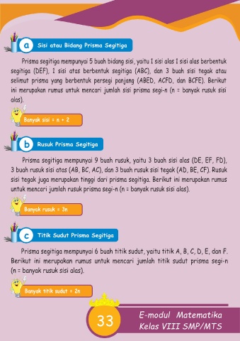 Prisma segitiga mempunyai 9 buah rusuk, yaitu 3 buah sisi alas (DE, EF, FD),