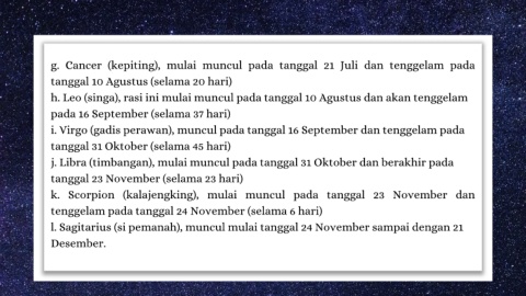 g. Cancer (kepiting), mulai muncul pada tanggal 21 Juli dan tenggelam pada