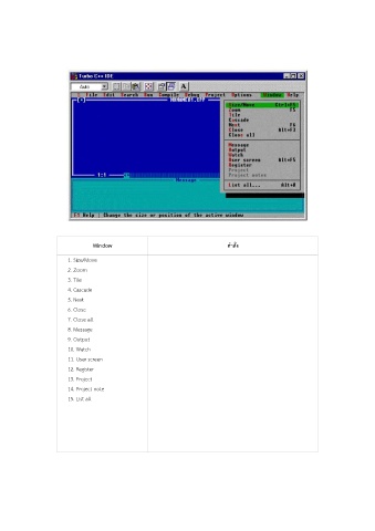 Window คำสั่ง 1. Size/Move 2. Zoom 3. Tile 4. Cascade 5. Next 6. Close 7. Close all 8. Message 9. Output 10. Watch 11. User screen 12. Register 13. Project 14. Project note 15. List all