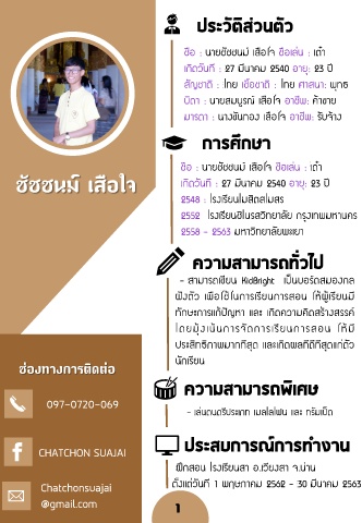 ประวัติส่วนตัว การศึกษา ชัชชนม์ เสือใจ ความสามารถทั่วไป ช่องทางการติดต่อ ความสามารถพิเศษ 097-0720-069 ประสบการณ์การท างาน CHATCHON SUAJAI Chatchonsuajai @gmail.com 1
