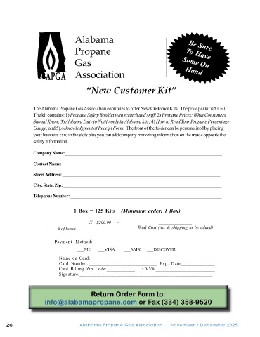 TheAlabama Propane GasAssociation continues to offer New Customer Kits. The price per kit is $1.60.