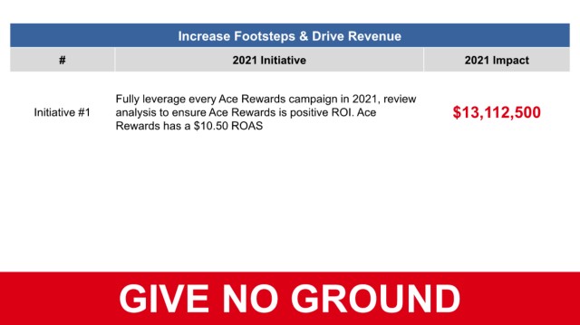 Initiative #1 analysis to ensure Ace Rewards is positive ROI. Ace $13,112,500
