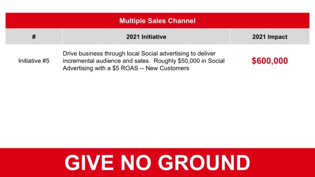 Initiative #5 incremental audience and sales. Roughly $50,000 in Social $600,000