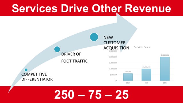 Services Drive Other Revenue NEW CUSTOMER ACQUISITION Services Sales $2,500,000 DRIVER OF $2,000,000 $2,000,000 FOOT TRAFFIC $1,500,000 $1,000,000 $1,000,000 COMPETITIVE $500,000 $600,000 DIFFERENTIATOR $0 2019 2020 2021 250 – 75 – 25