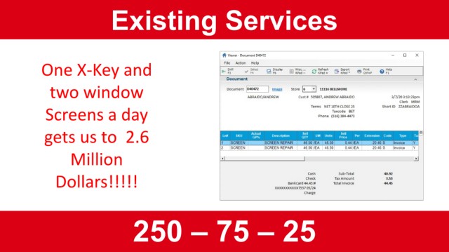 Existing Services One X-Key and two window Screens a day gets us to 2.6 Million Dollars!!!!! 250 – 75 – 25
