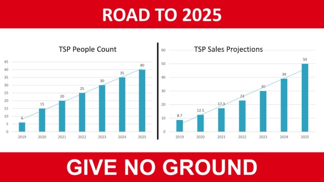 ROAD TO 2025 TSP People Count 60 TSP Sales Projections 50 45 50 40 40 35 39 35 40 30 30 30 25 25 30 20 23 20 15 20 17.3 15 12.5 10 6 10 8.7 5 0 0 2019 2020 2021 2022 2023 2024 2025 2019 2020 2021 2022 2023 2024 2025 GIVE NO GROUND