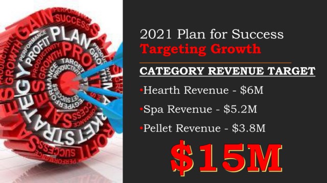 2021 Plan for Success Targeting Growth CATEGORY REVENUE TARGET •Hearth Revenue - $6M •Spa Revenue - $5.2M •Pellet Revenue - $3.8M