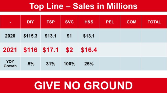 Top Line – Sales in Millions - DIY TSP SVC H&S PEL .COM TOTAL 2020 $115.3 $13.1 $1 $13.1 2021 $116 $17.1 $2 $16.4 YOY .5% 31% 100% 25% Growth GIVE NO GROUND