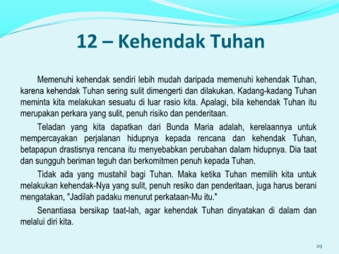 Teladan yang kita dapatkan dari Bunda Maria adalah, kerelaannya untuk