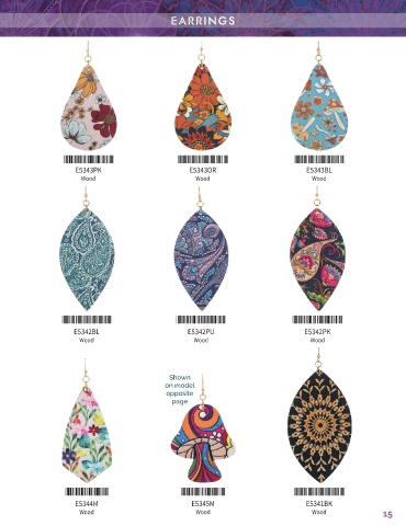 EARRINGS *E5343PK* *E5343OR* *E5343BL* E5343PK E5343OR E5343BL Wood Wood Wood *E5342BL* *E5342PU* *E5342PK* E5342BL E5342PU E5342PK Wood Wood Wood Shown on model opposite page *E5344M* *E5345M* *E5341BK* E5344M E5345M E5341BK Wood Wood Wood 15