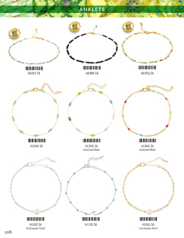 ANKLETS *A83GY* *A83BK* *A83TQ* A83GY $8 A83BK $8 A83TQ $8 *A134G* *A135G* *A136G* A134G $6 A135G $6 A136G $6 Assorted Multi Assorted Multi *A126S* *A119S* *A126G* A126S $6 A119S $6 A126G $6 Freshwater Pearl Freshwater Pearl 108