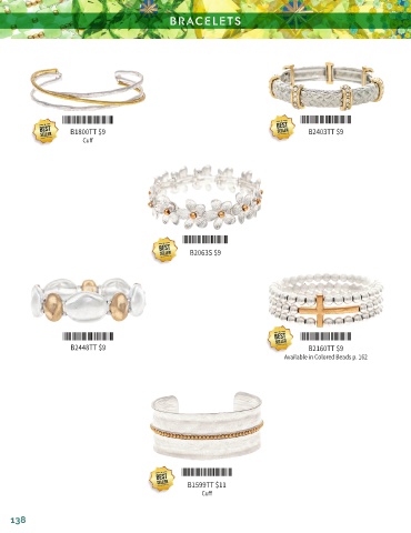 BRACELETS *B1800TT* *B2403TT* B1800TT $9 B2403TT $9 Cuff *B2063S* B2063S $9 *B2448TT* *B2160TT* B2448TT $9 B2160TT $9 Available in Colored Beads p. 162 *B1599TT* B1599TT $11 Cuff 138
