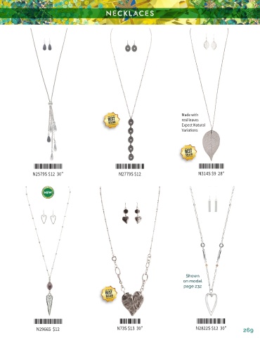 NECKLACES Made with real leaves Expect Natural Variations *N2579S* *N2779S* *N314S* N2579S $12 30” N2779S $12 N314S $9 28” Shown on model page 232 *N2966S* *N73S* *N2822S* N2966S $12 N73S $13 30” N2822S $12 30" 269
