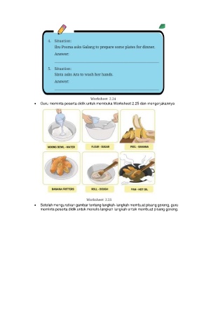 Guru meminta peserta didik untuk membuka Worksheet 2.25 dan mengerjakannya Setelah mengurutkan gambar tentang langkah-langkah membuat pisang goreng, guru meminta peserta didik untuk menulis langkah langkah untuk membuat pisang goreng.