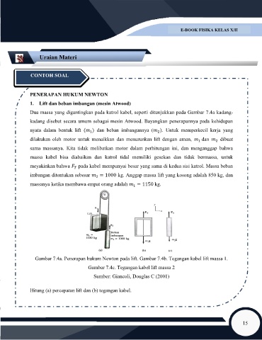 Gambar 7.4a. Penerapan hukum Newton pada lift. Gambar 7.4b. Tegangan kabel lift massa 1.