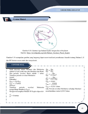 Gambar 8.10. Ilustrasi tiga hukum Kepler dengan dua orbit planet