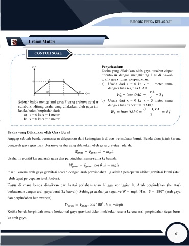 berlawanan dengan arah gaya berat (ke bawah). Sehingga usahanya negative W = -mgh. Hasil (arah gaya