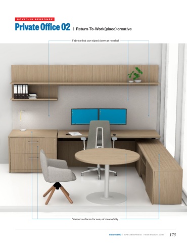 CO VID - 19 RE SP ONSE Private Office 02 | Return-To-Work(place) creative Fabrics that can wiped down as needed Veneer surfaces for easy of cleanability Starwood HQ | 2340 Collins Avenue | Miami Beach, FL 33139 173