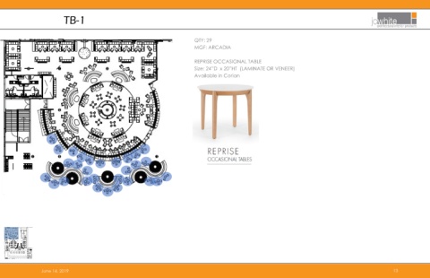 TB-1 QTY: 29 MGF: ARCADIA REPRISE OCCASIONAL TABLE Size: 24”D x 20”HT (LAMINATE OR VENEER) Available in Corian June 14, 2019 13