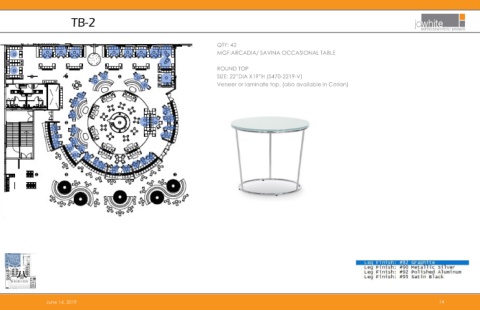 TB-2 QTY: 42 MGF:ARCADIA/ SAVINA OCCASIONAL TABLE ROUND TOP SIZE: 22”DIA X19”H (5470-2219-V) Veneer or laminate top. (also available in Corian) June 14, 2019 14