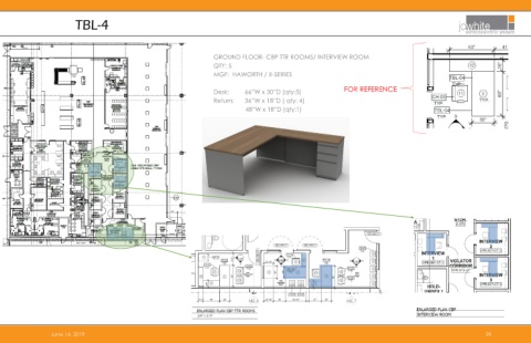 TBL-4 GROUND FLOOR- CBP TTR ROOMS/ INTERVIEW ROOM QTY: 5 MGF: HAWORTH / X-SERIES Desk: 66”W x 30”D (qty:5) FOR REFERENCE Return: 36”W x 18”D ( qty: 4) 48”W x 18”D (qty:1) June 14, 2019 26