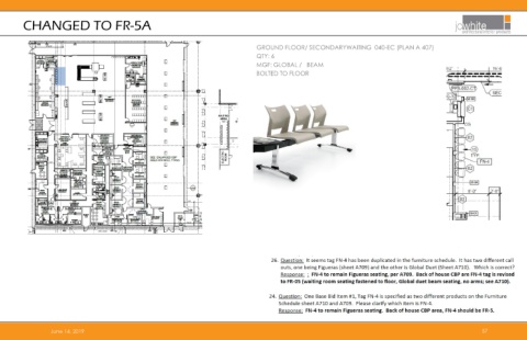 CHANGED TO FR-5A GROUND FLOOR/ SECONDARYWAITING 040-EC (PLAN A 407) QTY: 6 MGF: GLOBAL / BEAM BOLTED TO FLOOR June 14, 2019 57