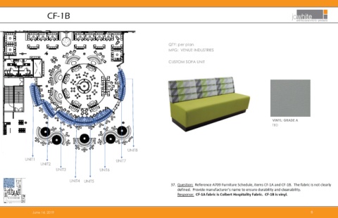 CF-1B QTY: per plan MFG: VENUE INDUSTRIES CUSTOM SOFA UNIT VINYL: GRADE A TBD UNIT8 UNIT1 UNIT7 UNIT2 UNIT3 UNIT6 UNIT4 UNIT5 June 14, 2019 8
