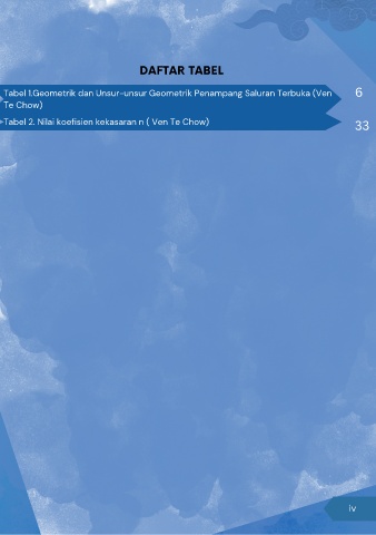 DAFTAR TABEL Tabel 1.Geometrik dan Unsur-unsur Geometrik Penampang Saluran Terbuka (Ven 6 Te Chow) Tabel 2. Nilai koefisien kekasaran n ( Ven Te Chow) 33 iv