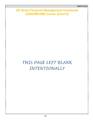 FROM THE FIELD US Army Financial Management Command (USAFMCOM) Corner (Cont’d) THIS PAGE LEFT BLANK INTENTIONALLY 15