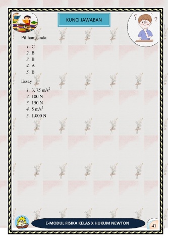 KUNCI JAWABAN Pilihan ganda 1. C 2. B 3. B 4. A 5. B Essay 2 1. 3, 75 m/s 2. 100 N 3. 150 N 2 4. 5 m/s 5. 1.000 N E-MODUL FISIKA KELAS X HUKUM NEWTON 41