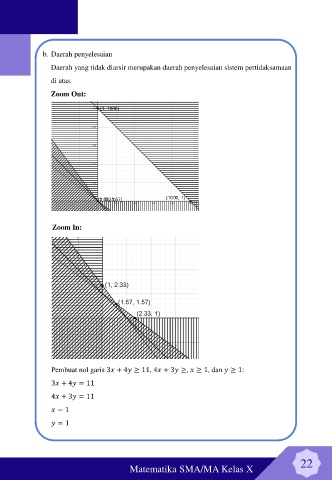 b. Daerah penyelesaian Daerah yang tidak diarsir merupakan daerah penyelesaian sistem pertidaksamaan di atas. Zoom Out: Zoom In: Pembuat nol garis 3 + 4 ≥ 11, 4 + 3 ≥, ≥ 1, dan ≥ 1: 3 + 4 = 11 4 + 3 = 11 = 1 = 1 22 Matematika SMA/MA Kelas X
