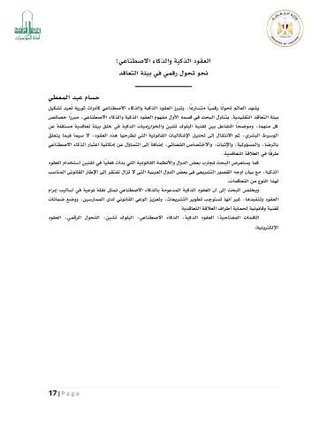 الكلمات المفتاحية :العقود الذكية ،الذكاء الاصطناعي ،البلوك تشين ،التحول الرقمي ،العقود