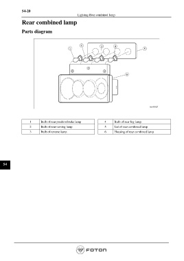 54-20 Lighting-Rear combined lamp Rear combined lamp Parts diagram 1 Bulb of rear position/brake lamp 4 Bulb of rear fog lamp 2 Bulb of rear turning lamp 5 Lid of rear combined lamp 3 Bulb of reverse lamp 6 Housing of rear combined lamp 54 Page 1220